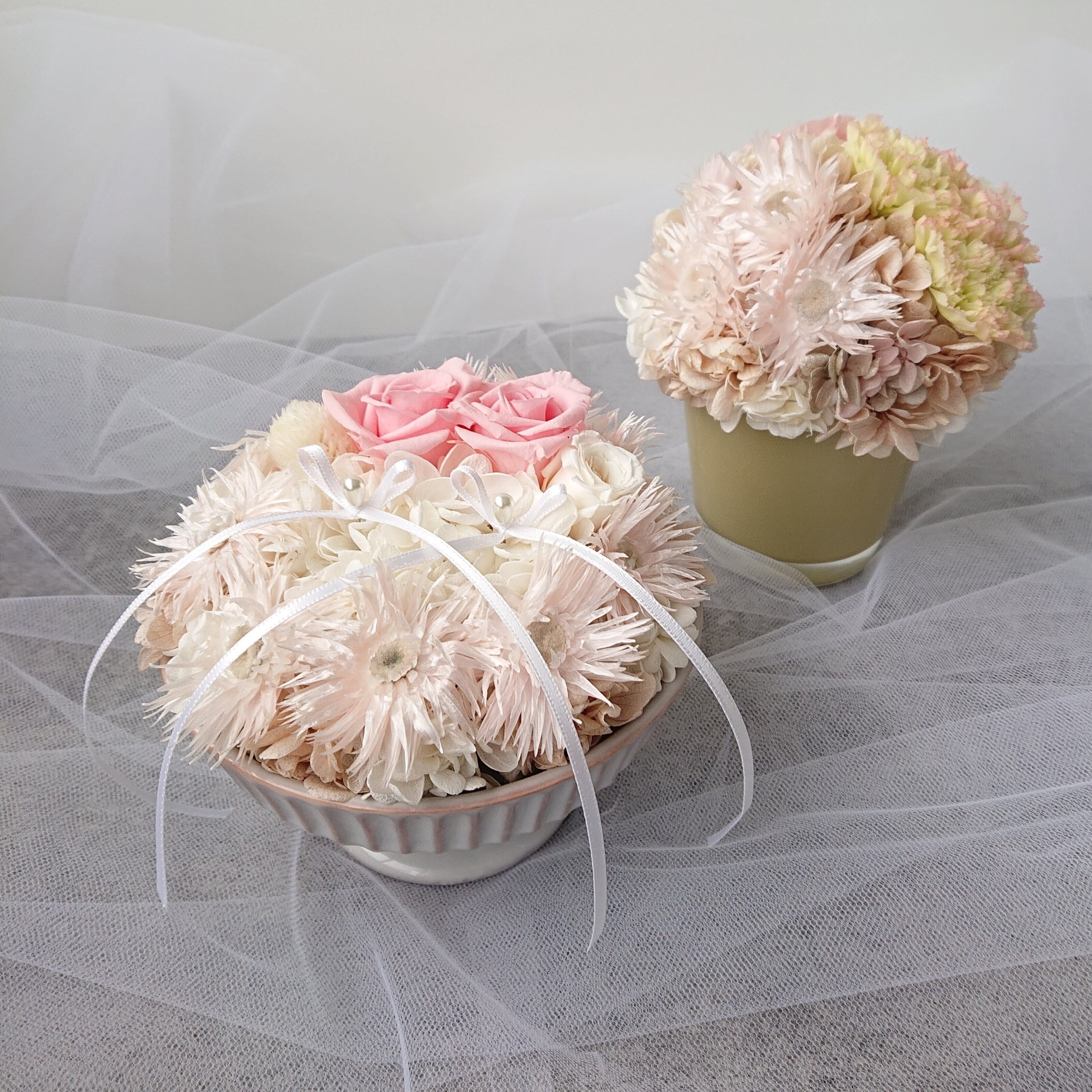 ウェディングのためのリングピロー。一大イベントのリング交換を素敵に演出する一品です。持ちやすい高台のアンティークグレイの器は持ちやすく高貴です。お式後は想い出をお傍に…インテリアとして飾っても素敵です。ウエルカムスペースに飾っていただける『シャンパンカラーのデージーポット』とお揃いの花と色でお創りしていますので、セットでご購入も素敵です。大輪のピンクのバラは気品があり、ドライフラワーのほんのりピンクのシルバーデージーはシルクのような光沢で可愛らしくて上品な雰囲気です。結婚式に相応しい優しいプリザーブドフラワーリングピローに仕上がりました。
